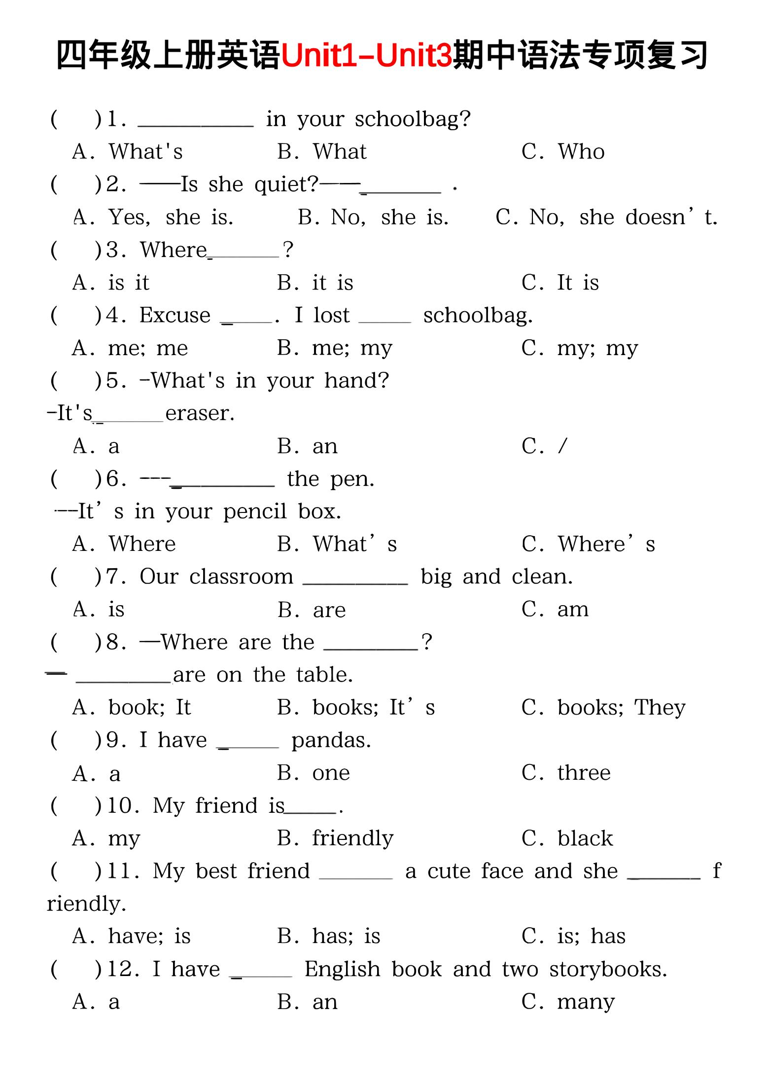 四年级上PEP版英语期中语法专项复习